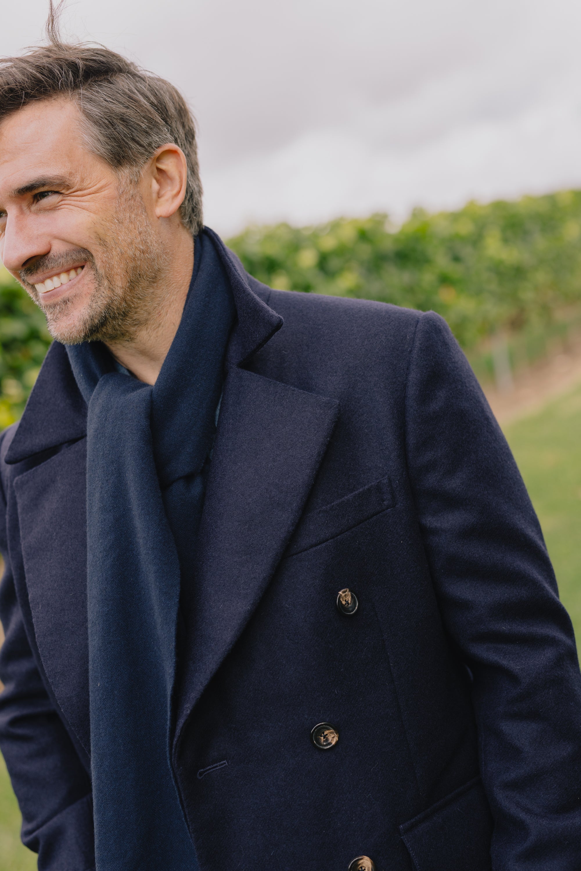 Cut in a dense navy blue English cloth. With the wool inspired from heritage archives, this coat will keep you warm in the harshest conditions. With a structured handle, the wool will soften overtime with wear.